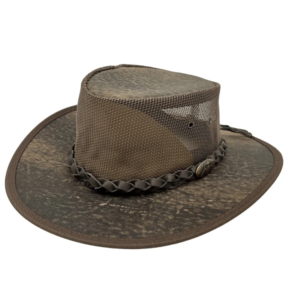 Australský kožený klobouk Roo Koolaroo Roo Koolaroo je velmi lehký klobouk vybavený síťkou a je ideální pro horké dny, kdy chrání před sluncem a zároveň zůstává maximálně vzdušný.. Široká krempa je vyrobaná z kvalitní klokaní kůže a všitým paměťovým drátem. Koruna klobouku je z odolné síťoviny s vr... celý popis