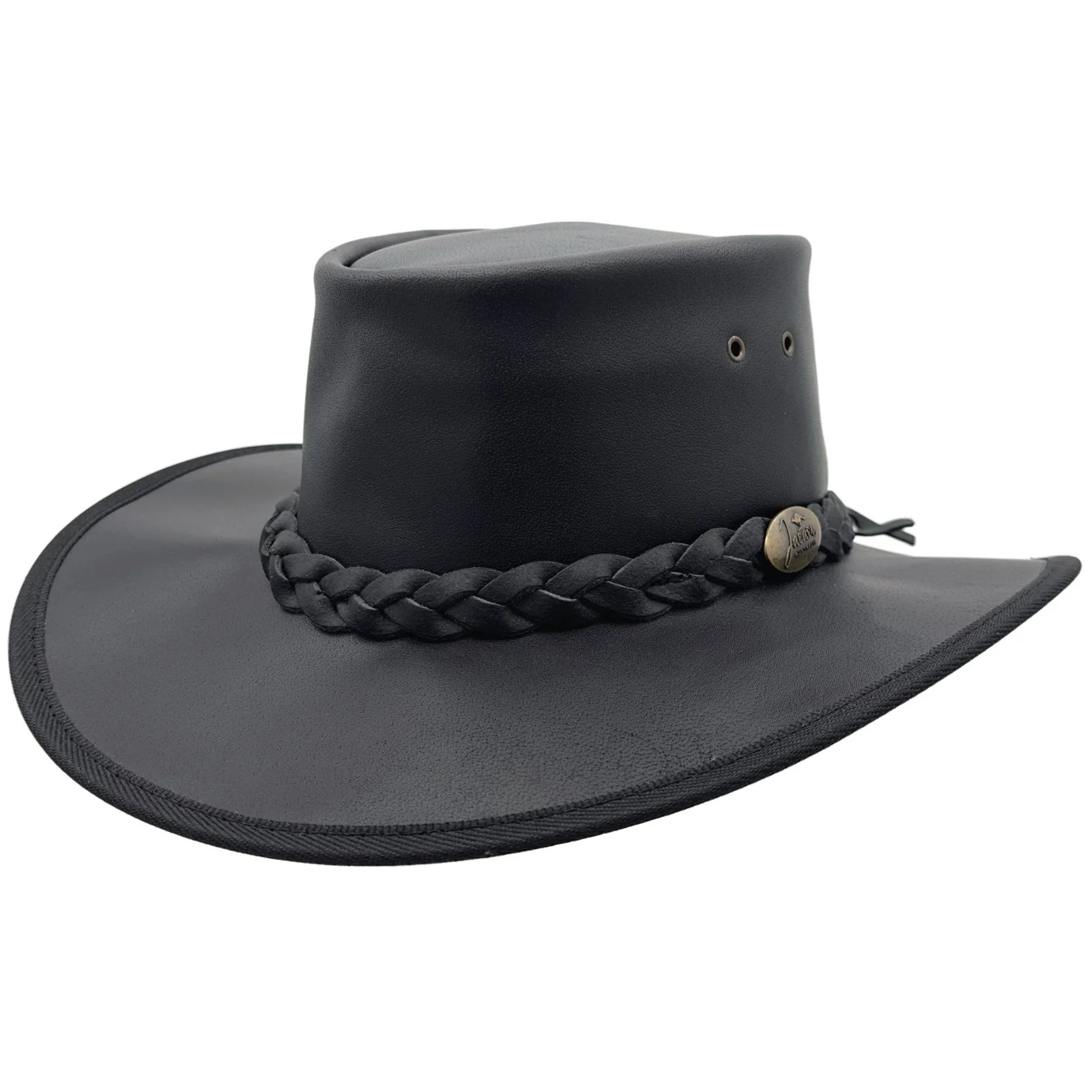 Stockman je klasický australský outback klobouk z bůvolí impregnované kůže odolné vůči počasí. Je vybaven praktickými větracími očky pro snadné odvětrání v horkých dnech. Klobouk je ozdoben pleteným páskem z pravé kůže s mosazným logem Jacaru.